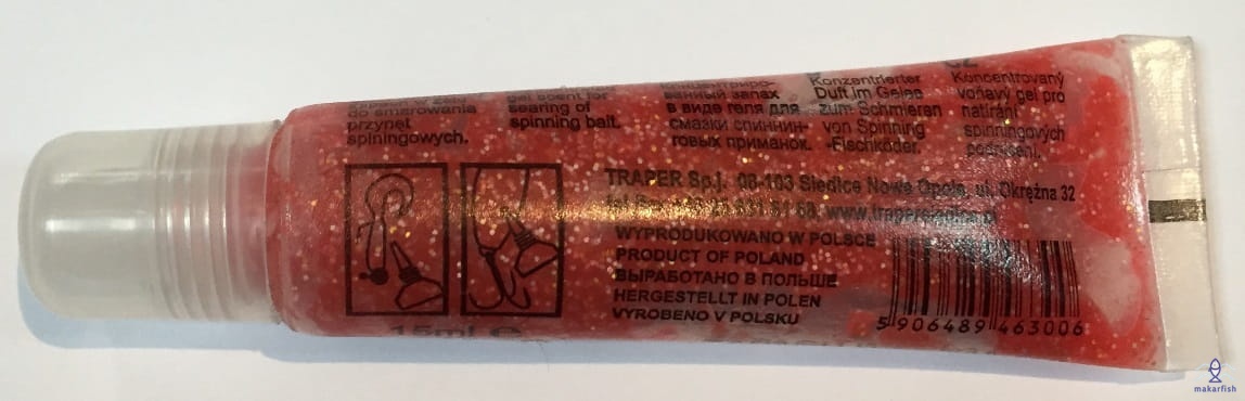 Skoncentrowany zapach w żelu, do smarowania przynęt spinningowych.W żelu znajduje się brokat dzięki czemu przynęty są jeszcze lepiej widoczne dla ryby. Niezwykle poprawia skuteczność gum, blach czy woblerów, które posmarowane tym specyfikiem pozostawiają za sobą silnie wabiącą smugę.