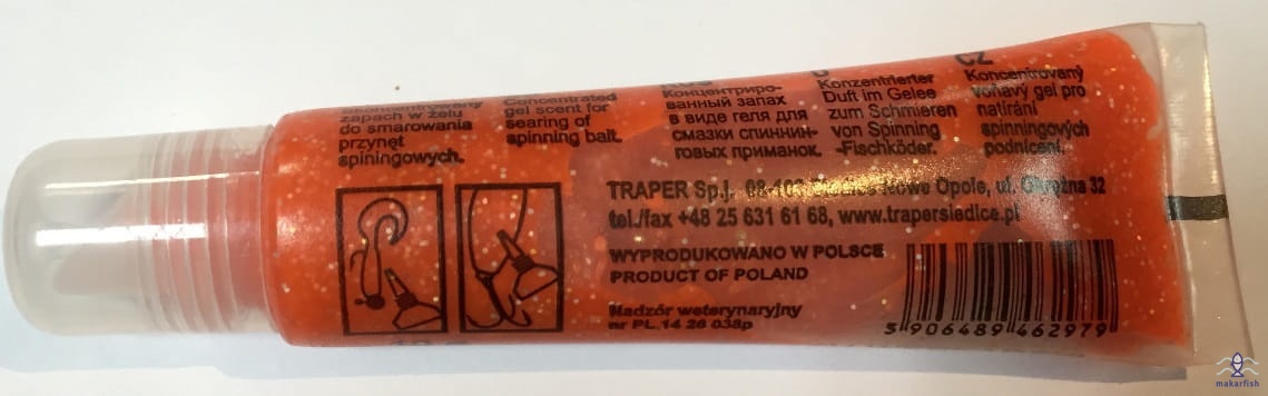 Skoncentrowany zapach w żelu, do smarowania przynęt spinningowych.W żelu znajduje się brokat dzięki czemu przynęty są jeszcze lepiej widoczne dla ryby. Niezwykle poprawia skuteczność gum, blach czy woblerów, które posmarowane tym specyfikiem pozostawiają za sobą silnie wabiącą smugę.