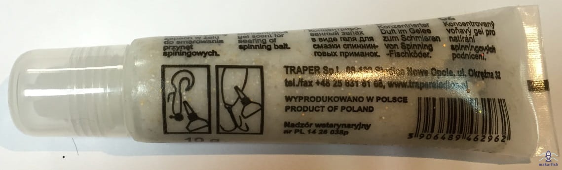 Skoncentrowany zapach w żelu, do smarowania przynęt spinningowych.W żelu znajduje się brokat dzięki czemu przynęty są jeszcze lepiej widoczne dla ryby. Niezwykle poprawia skuteczność gum, blach czy woblerów, które posmarowane tym specyfikiem pozostawiają za sobą silnie wabiącą smugę.