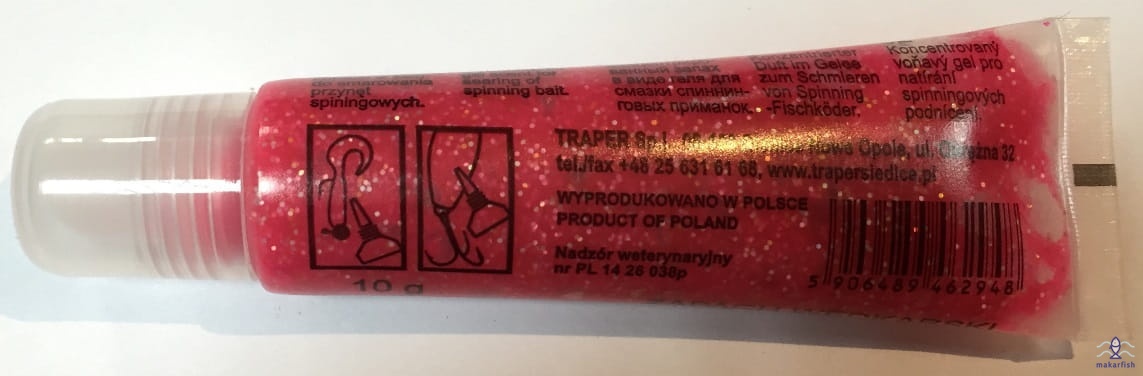 Skoncentrowany zapach w żelu, do smarowania przynęt spinningowych.W żelu znajduje się brokat dzięki czemu przynęty są jeszcze lepiej widoczne dla ryby. Niezwykle poprawia skuteczność gum, blach czy woblerów, które posmarowane tym specyfikiem pozostawiają za sobą silnie wabiącą smugę.