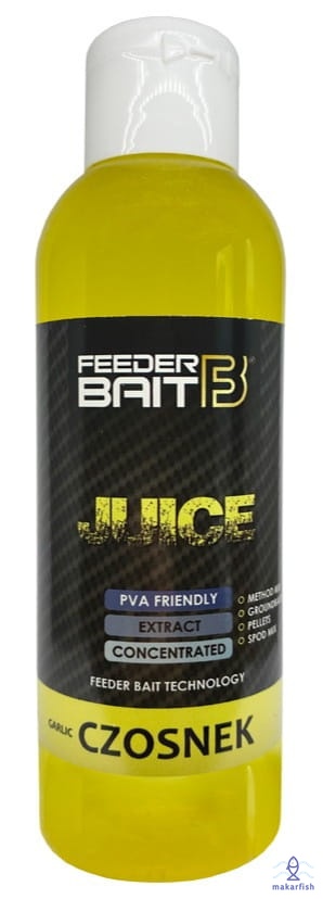 Juice Feeder Bait to niezwykle gęste zalewy służące do podniesienia walorów smakowych i zapachowych stosowanych zanęt, mixów, pelletów, ziaren. Najlepsze efekty ich zastosowania możemy zauważyć podczas nęcenia w okresie letnim oraz na łowiskach o znacznym zamuleniu i gęstej roślinności przydennej czyli zawsze wtedy kiedy musimy przebić się z aromatem przez specyficzny zapach panujący w wodzie. Juice Feeder Bait występują w sześciu smakach i w większości przypadków są to aromaty łączone tak aby osiągnąć efekt podwójnego wabienia. Nie rozpuszcza PVA.