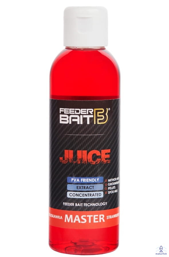 Juice Feeder Bait to niezwykle gęste zalewy służące do podniesienia walorów smakowych i zapachowych stosowanych zanęt, mixów, pelletów, ziaren. Najlepsze efekty ich zastosowania możemy zauważyć podczas nęcenia w okresie letnim oraz na łowiskach o znacznym zamuleniu i gęstej roślinności przydennej czyli zawsze wtedy kiedy musimy przebić się z aromatem przez specyficzny zapach panujący w wodzie. Juice Feeder Bait występują w sześciu smakach i w większości przypadków są to aromaty łączone tak aby osiągnąć efekt podwójnego wabienia. Nie rozpuszcza PVA.