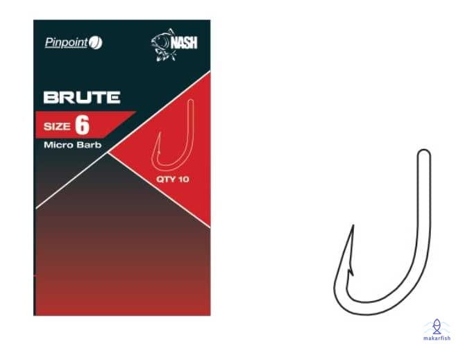 Średnica drutu użytego do jego produkcji jest o 20% większa w porównaniu do innych haków z serii, a przy tym jest niesłychanie ostry. Brute ma proste ostrze, a oczko zostało zagięte pod kątem 12 stopni do wewnątrz. Średnica oczka jest duża, co pozwala na stosowanie grubych materiałów przyponowych. Brute może zostać użyty zarówno z kulkami tonącymi jak i pływającymi. To hak, który sprosta największym rybom w najbardziej wymagających warunkach. 10 sztuk w opakowaniu.
