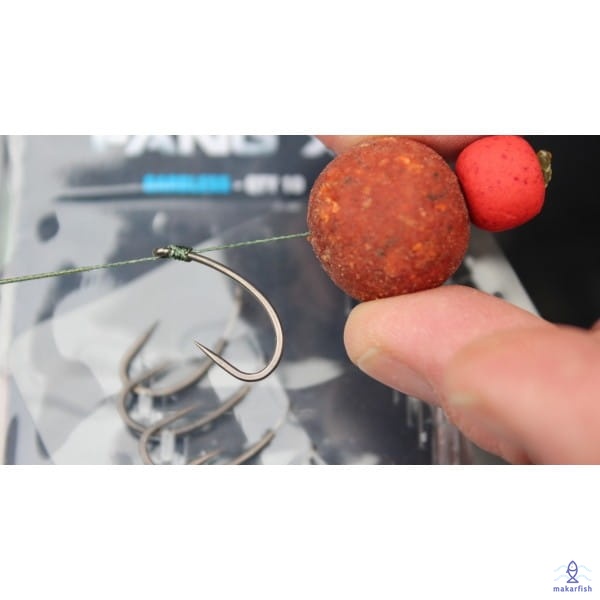 Haczyk Nash Fang X posiada zakrzywiony trzonek, oczko haczyka natomiast jest wygięte do wewnątrz pod kątem 20 stopni. Zapobiega to wypluciu przyponu przez karpia i gwarantuje pewne zacięcie.