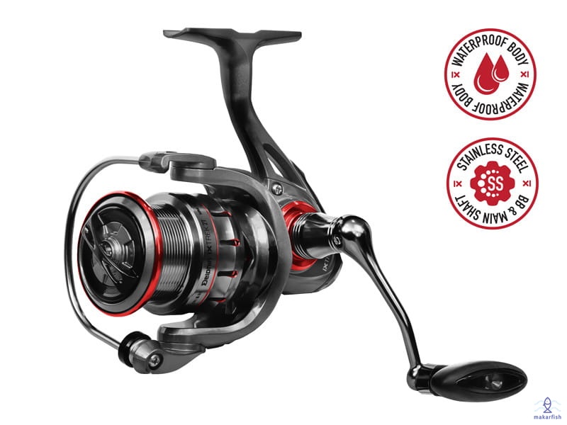 Ciemna powierzchnia z czerwonymi dodatkami sprawia, że jest naprawdę ekskluzywny pod względem wzornictwa. Sercem kołowrotka jest wypróbowany i przetestowany mechanizm z doskonale wyważonym rotorem, dzięki czemu jego użytkowanie jest bardzo płynne i bezproblemowe. Korpus wykonany jest z lekkiego materiału kompozytowego, który zapewnia dużą żywotność i doskonałą odporność na uszkodzenia mechaniczne.