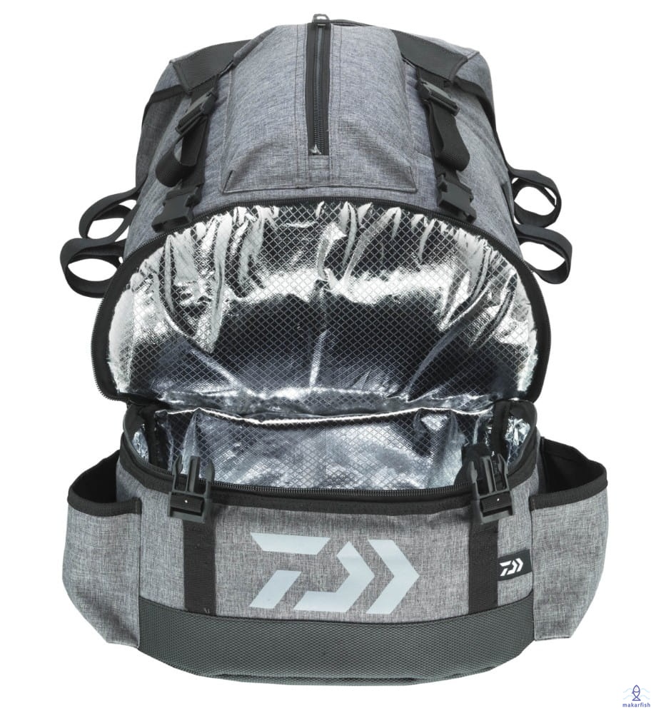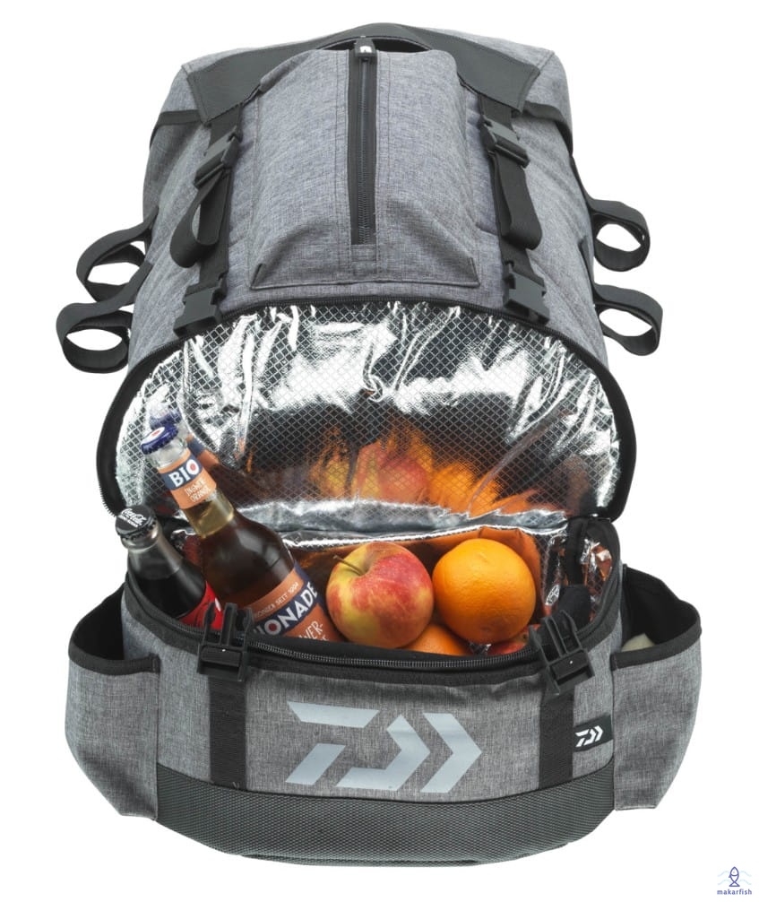 Duży plecak o pojemności 30l posiadający dodatkową komorę chłodzącą na spodzie. Dwie kieszenie boczne bezpiecznie pomieszczą zamontowane do transportu wędki. Siatka z tyłu zapewnia dobrą cyrkulację powietrza, a pikowane paski na ramiona oferują wyjątkowy komfort noszenia. Oddzielna mała kieszeń z przodu z łatwością pomieści małe akcesoria i rzeczy osobiste. Wnętrze torby można łatwo wyczyścić. Nakładana pokrywa zapewnia dobrą ochronę przed opadami deszczu i zachlapaniem. Gumowane dno jest wodoodporne i eliminuje przenikanie wilgoci z mokrych gruntów.