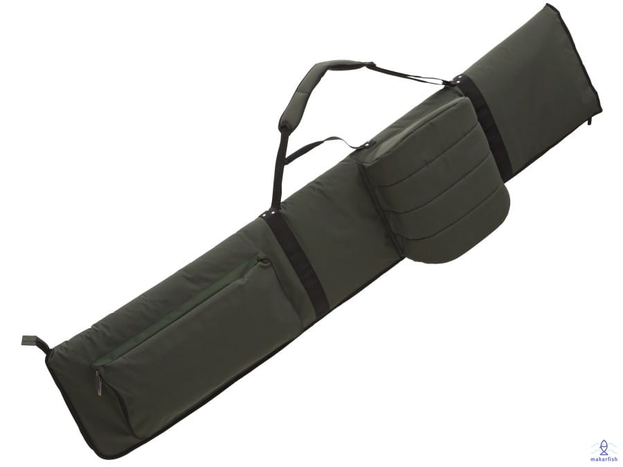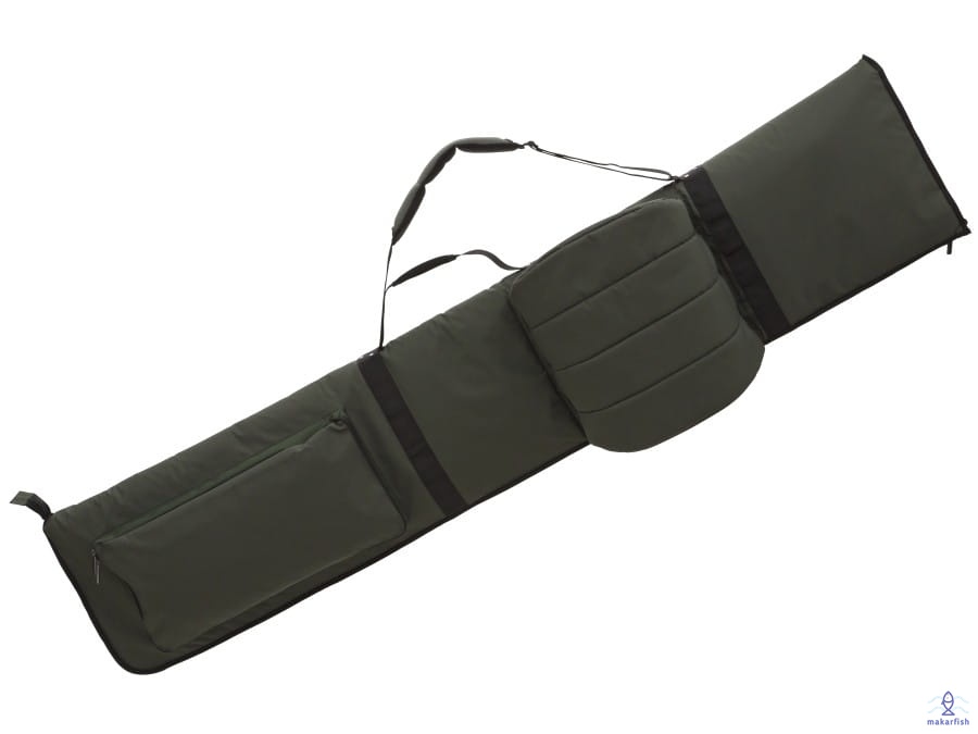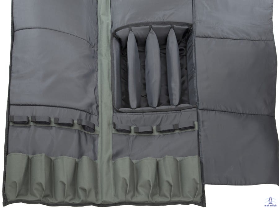 Pokrowiec na 4 uzbrojone wędziska. Dostępny dla wędek 12- i 13- stopowych. Z wieloma dodatkowymi kieszeniami na sztyce, buzzerbar‘y, parasol etc. Wykonany z materiału 600D.