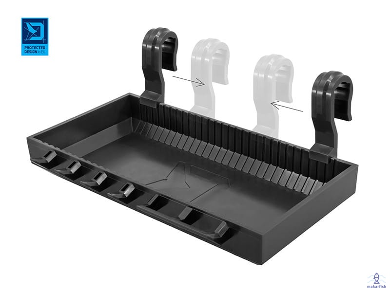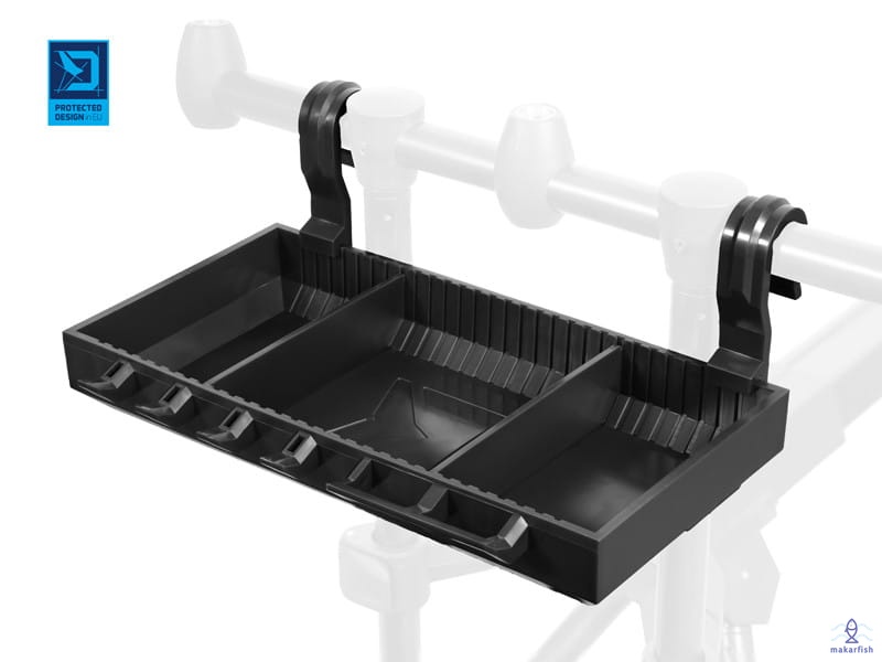 Praktyczna półka naszego własnego projektu, która przyda się każdemu wędkarzowi posiadającemu rodpod, tripod lub pojedyncze buzz bary na bankstickach. Nadaje się do przechowywania różnych małych akcesoriów lub przynęt. Oznacza to, że zawsze będziesz mieć te małe elementy pod ręką gotowe tuż obok zarzuconych wędek. ShelfPOD ma podniesione krawędzie, aby utrzymać sprzęt w bezpiecznym miejscu. Dno jest perforowane, aby odprowadzać nadmiar wody podczas deszczu. Dwa mocne plastikowe haczyki pozwalają łatwo zawiesić półkę na uchwycie, a ponieważ można je odłączyć, można przenieść półkę do namiotu lub umieścić ją na stole. Z przodu znajdują się również haczyki do zawieszenia sprzętu. Mogą być używane do igieł, nożyczek lub innych małych elementów. Wyjmowane przegrody pozwalają zoptymalizować przestrzeń do przechowywania w zależności od potrzeb. Półka została zaprojektowana w ulubionym czarnym wzorze BlackWAY.