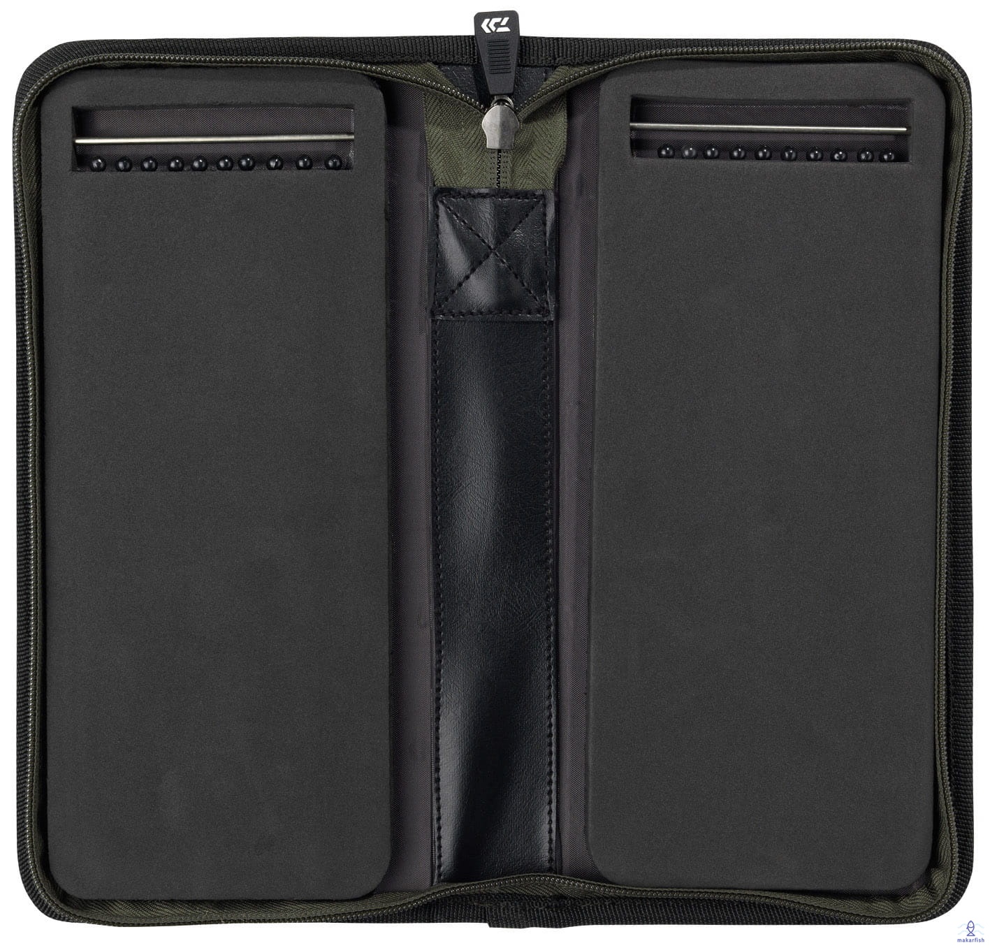 Klasyczna portfel do przechowywania przyponów włosowych, haków itp. Sztywne etui na zestawy włosowe i przypony. Zamykane na zamek. Wyposażone w dwie piankowe tablice do przechowywania zestawów. Każda z nich posiada pineski (po 10 szt na stronę) i stalowe uchwyty na haki. Sztywne ścianki i eleganckie wykonanie.