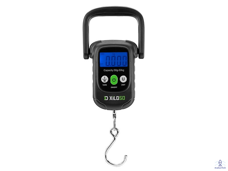 Cyfrowa waga do precyzyjnego pomiaru ciężaru od 50 g do 50 kg. XILO posiada trzy przyciski do prostego sterowania. Aby włączyć lub wyłączyć wagę, należy nacisnąć przycisk ON/OFF. Poprzez krótkie naciśnięcie przycisku U (UNIT) można zmieniać jednostki wagi (kg, lbs, JIN, oz) na wyświetlaczu. Funkcja TARE pozwala na założenie worka wagowego na hak, a naciśnięcie przycisku TARE spowoduje wyzerowanie wagi, która była już na wadze. Po włożeniu ryby do worka wagowego, na wyświetlaczu pojawi się tylko waga połowu.