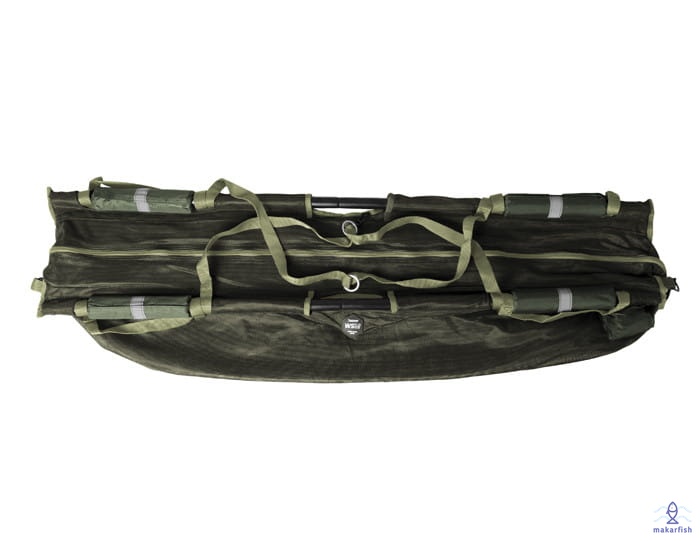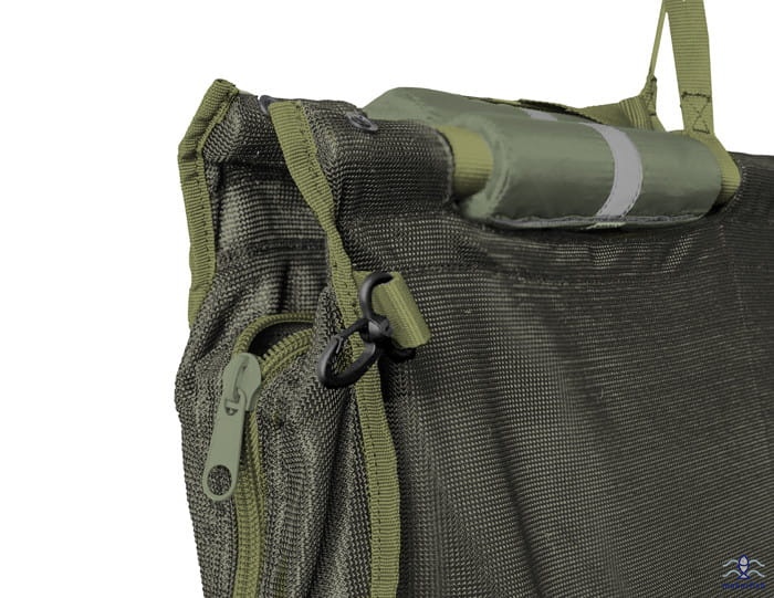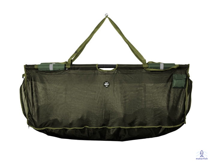 Torba ważąca wykonana z mocnego materiału siatkowego, który może być również używany jako worek do przechowywania ryb, ponieważ posiada pływaki i materiał siatkowy. Dzięki taśmom odblaskowym na pływakach możesz zobaczyć worek w wodzie, nawet gdy świecisz nią w ciemności lampą czołową. Materiał siatkowy obniża całkowitą wagę worka, a podczas podnoszenia ryb lub podczas przenoszenia woda wycieka i nie przeciąża materiału, więc ważenie jest bardziej precyzyjne. Masywne zamki błyskawiczne znajdują się po obu stronach, jak również w górnej części, dzięki czemu WSM może być prawie całkowicie rozpinany, aby zapewnić ładniejszą i łatwiejszą manipulację rybą. Mocne aluminiowe rury o średnicy 25 mm można bez problemu składać, dzięki czemu nie wymagają dużej przestrzeni podczas transportu. Dostępne są trzy długie paski tekstylne, więc wieszanie go na statywie jest naprawdę wygodne i proste. Te paski mają metalowe oczka do zawieszenia torby na haku. Aby ułatwić przenoszenie torby, w rogach torby znajdują się cztery krótsze paski. Posiada również 4,5 metra linki kotwiczącej. Dzięki temu systemowi zakotwiczenie torby na brzegu jest bardzo bezpieczne. Linia jest umieszczona w zintegrowanej i dyskretnej torbie z boku torby. W górnej części i na boku torby znajduje się klips, który służy do mocowania prowadnic zamka błyskawicznego, aby zapobiec niepożądanemu otwarciu torby. Istnieje również możliwość zakupu dodatkowych klipsów, które również można wykorzystać do kotwiczenia.